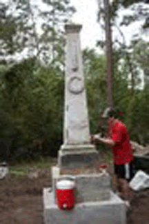 To the left is a photo of the owner's son working on the oblisk of White Turpin's daughter to restore it, along with other family tombstones |